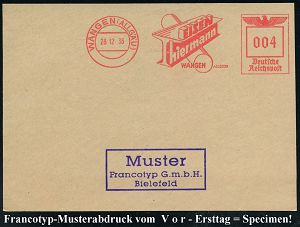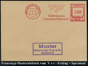 6132 | 35 € | POSTLEITRAUM 7900 (OHNE ULM) : WALDSEE (WÜRTT)/ WSW/ Württembergische/ Seidenweberei.. 1935 (17.5.) AFS-Musterabdruck Francotyp "Hakenkreuz" (Monogr.-Logo) glasklar gest. Francotyp-Musterblatt vom V o r - Ersttag ! (mit Attest), selten! (Dü.E-3CEo) | ![]() ![]() | |
