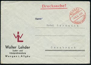 6136 | 12 € | POSTLEITRAUM 7900 (OHNE ULM) : WANGEN/ (ALLGÄU)/ Gebühr bezahlt 1932 (26.10.) 1K-Brücken-PFS 4 Pf. auf zweifarbigem Firmen-Bf.: Walter Lehder, Butter- u. Käsegroßhandlung.. (Dü.A-6, Nr.25) | ![]() | |