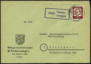 6092 | 12 € | POSTLEITRAUM 7900 (OHNE ULM) : 7989 Nieder-/ wangen 1962 (8.8.) viol. Ra. = PSt.II + aptierter 2-StegK: WANGEN (ALLGAU)/b = alte PLGZ entfernt , Kommunal-Bf.: Bürgermeisteramt, (14b) Niederwangen (Wappen) n. Stuttgart (Mi.352/EF) | ![]() | |