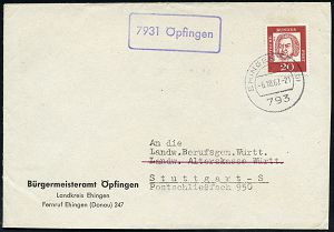 6093 | 12 € | POSTLEITRAUM 7900 (OHNE ULM) : 7931 Öpfingen 1962 (6.10.) viol. Ra. = PSt.II + 1K-Segment: 793 EHINGEN (DONAU)/f ,klar gest. Kommunal-Bf.: Bürgermeisteramt Öpfingen ohne PLZ (Mi.352 EF) | ![]() | |