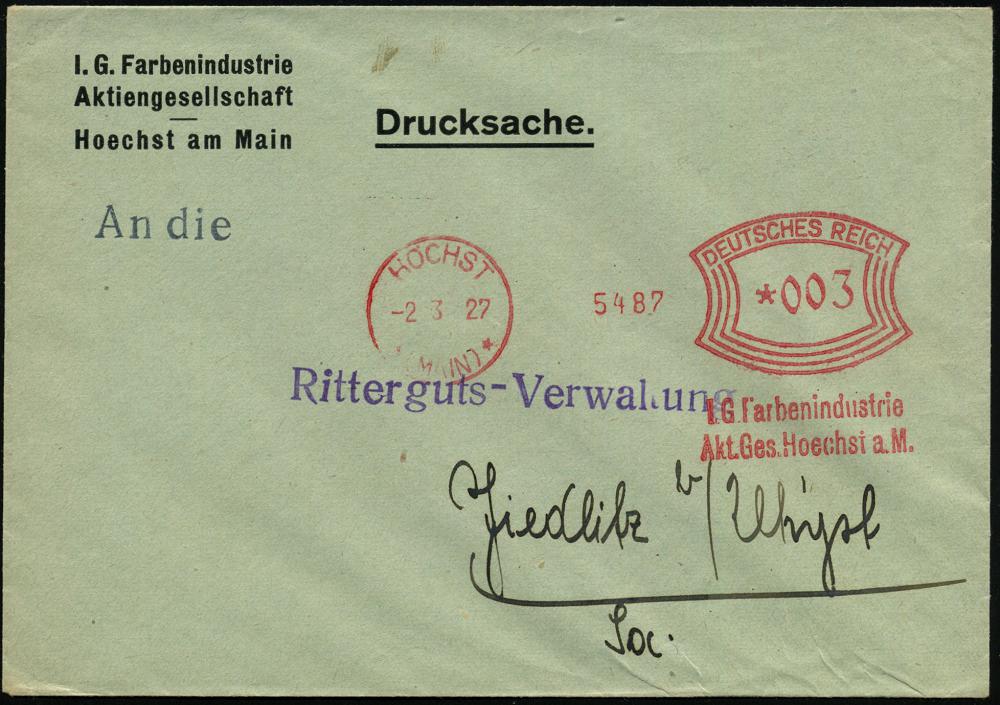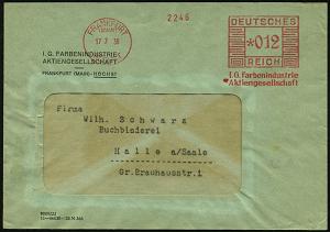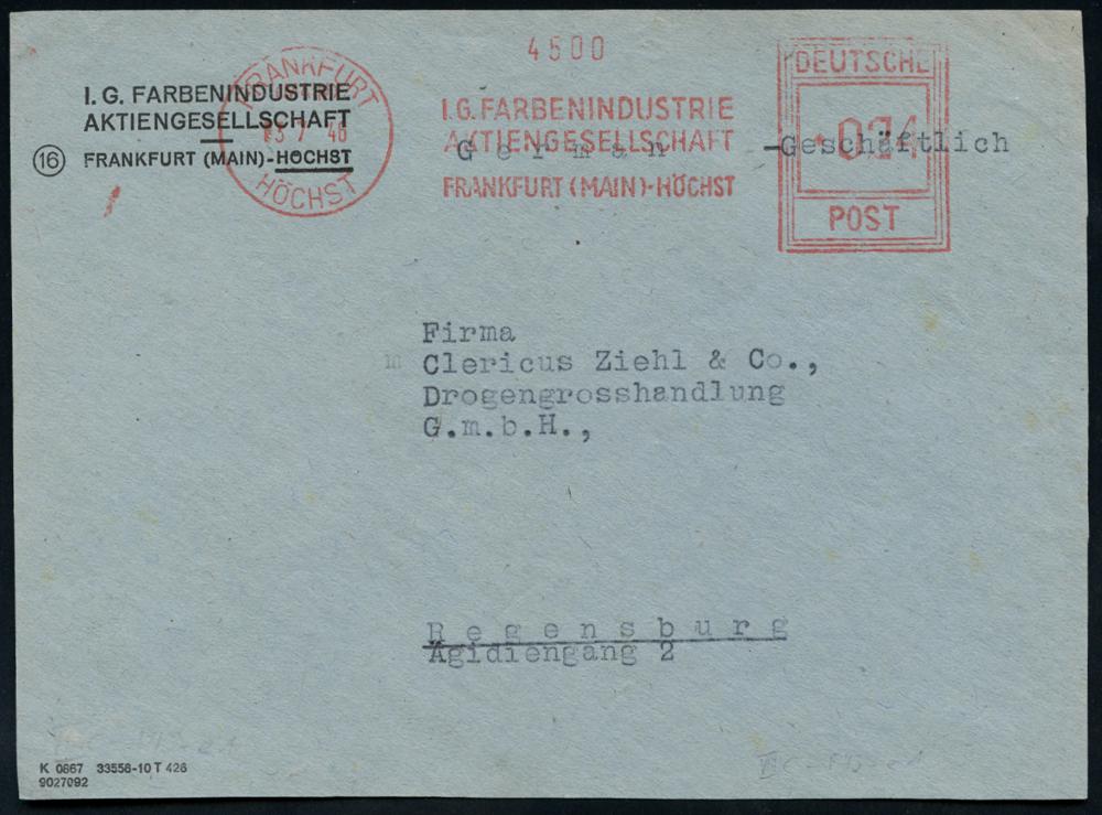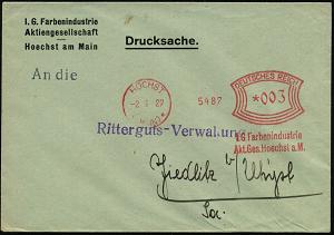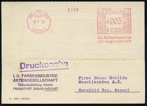 827 | 20 € | 6230 Frankfurt/M.-Höchst : FRANKFURT/ (MAIN)/ HÖCHST/ I.G.Farbenindustrie/ AG 1936 (17.7.) seltener AFS Francotyp "Mäanderrechteck" mit CD-Ziffern! , Firmen-Bf (leichte Bräunung im Fenster)., nur e i n e Maschine bekannt! (Dü.E-2CDh, Nr. 71 h) | ![]() | |