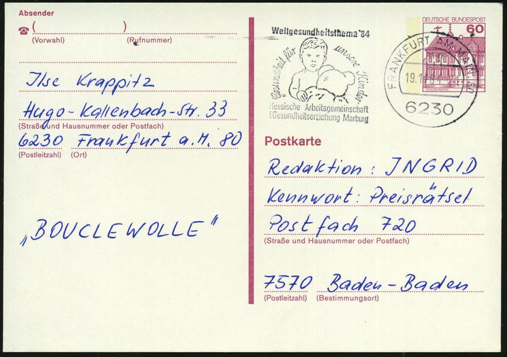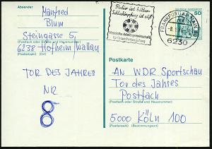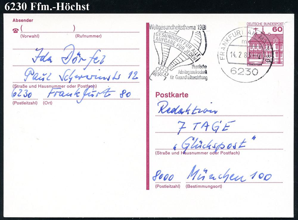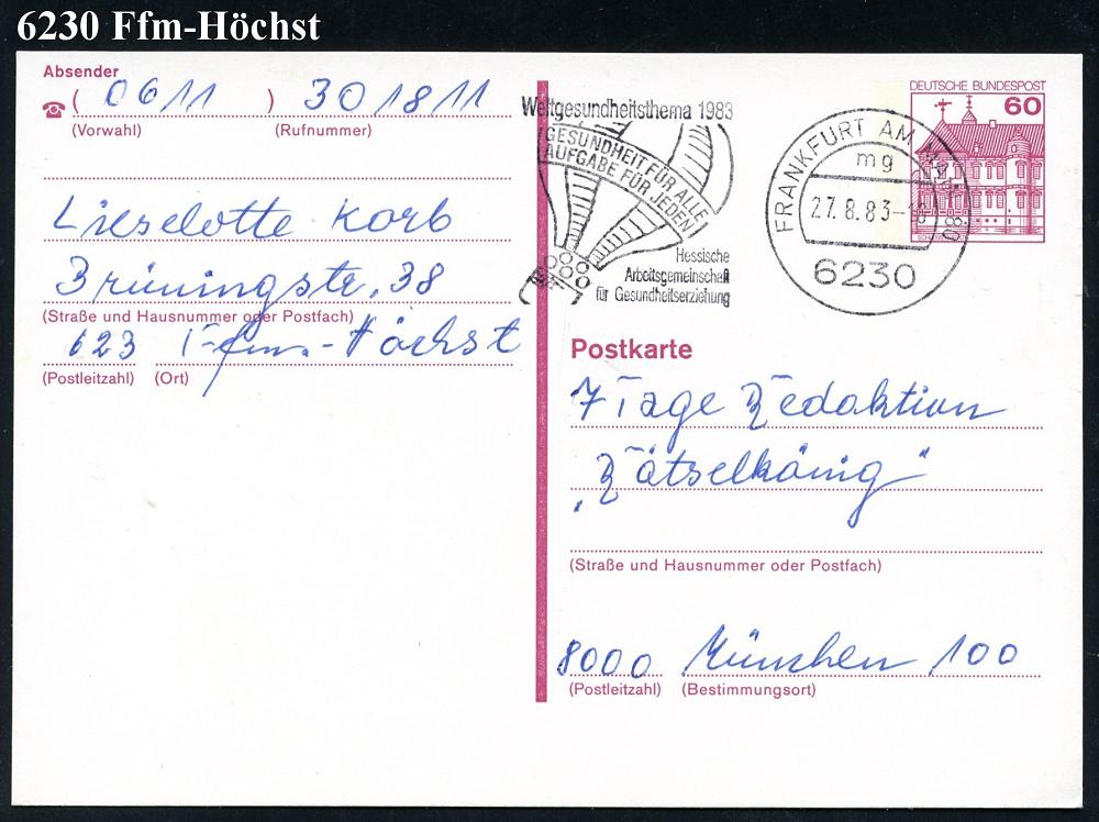 845 | 8 € | 6230 Frankfurt/M.-Höchst : 6230 FRANKFURT AM MAIN 80/ mg/ Weltgesundheitstag 1983/ GESUNDHEIT FÜR ALLE.. 1983 (Aug.) MWSt (Ballon) auf Bedarfs-Kt. (Bo.S 1364 A, UB "mg") | ![]() | |