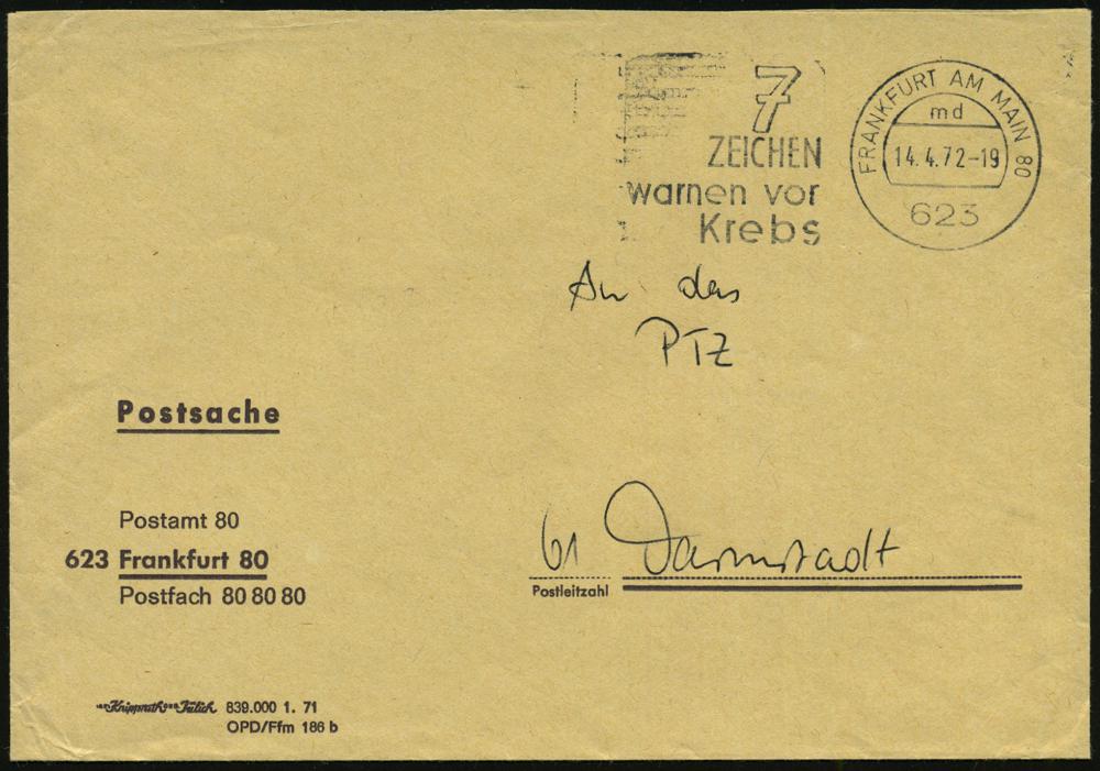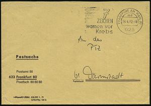 839 | 15 € | 6230 Frankfurt/M.-Höchst : 623 FRANKFURT AM MAIN 80/ 7/ ZEICHEN/ warnen vor/ Krebs 1972 (14.4.) seltener, aptierter MWSt (Familie im Klischee entfernt! vergl. Nr.838) klar gest. Postdienst-Bf. (Bo.S 1232 A ,nur in 2 Orte verwendet!) | ![]() | |