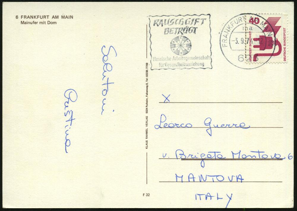 840 | 12 € | 6230 Frankfurt/M.-Höchst : 623 FRANKFURT AM MAIN 80/ ma/ RAUSCHGIFT/ BETRÜGT.. 1974 (3.9.) MWSt klar auf Ausl.-Ak. (Ffm) n. Italien (Bo.S 1247 A , nur in 3 Orten verwendet!) | ![]() | |