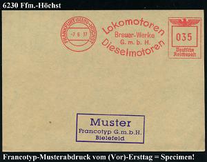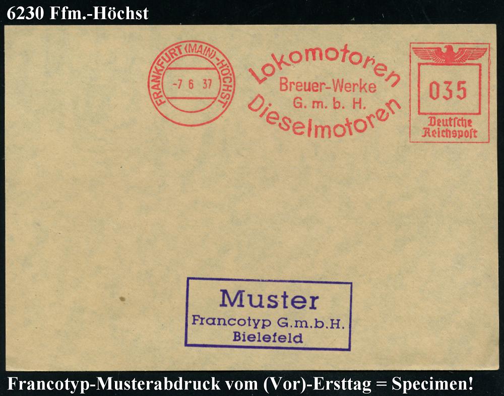 828 | 35 € | 6230 Frankfurt/M.-Höchst : FRANKFURT (MAIN)-HÖCHST/ Lokomotoren/ Dieselmotoren/ Breuer-Werke.. 1937 (7.6.) AFS-Musterabdruck Francotyo "Reichsadler" glasklar auf Francotyp-Musterblatt vom (Vor)-Ersttag!, selten!, vergl. Nr.829 (Dü.E-5CGo) | ![]() ![]() | |