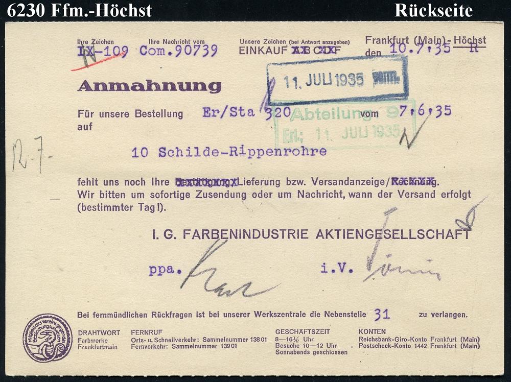 826 | 28 € | 6230 Frankfurt/M.-Höchst : FRANKFURT/ (MAIN)/ HÖCHST/ I.G.FARBENINDUSTRIE/ AG 1935 (10.7.) seltener AFS-Typ Francotyp "Mäander-rechteck" , Firmen-Kt., nur e i n e Maschine bekannt ! (Dü.E2-CDh mit Stern, Dü.Nr.71 h) | ![]() ![]() | |