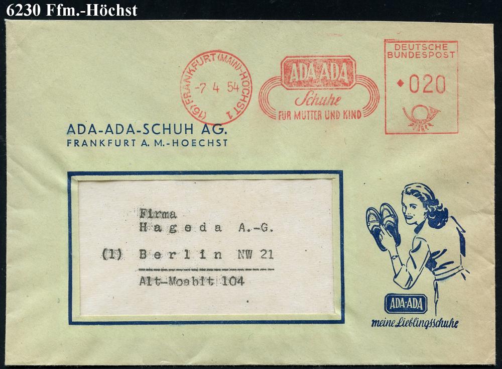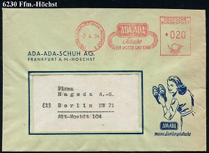 833 | 20 € | 6230 Frankfurt/M.-Höchst : (16) FRANKFURT (MAIN)-HÖCHST 1/ ADA ADA/ Schuhe/ FÜR MUTTER U.KIND 1954 (7.4.) AFS Francotyp "Posthorn" auf Reklame-Bf.: ADA-ADA meine Lieblingsschuhe (Dü.E-23DO mit Raute) | ![]() | |