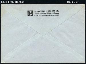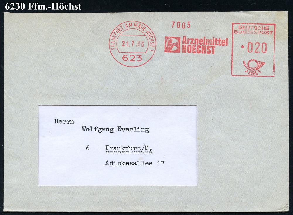835 | 18 € | 6230 Frankfurt/M.-Höchst : 623 FRANKFURT AM MAIN-HÖCHST 1/ Arzneimittel/ HOECHST 1965 (21.7.) AFS, seltene, verkürzte Spezialtype Francotyp (Firmen-Logo) rs. motivgl. Abs.-Vordruck, Fern-Bf. (Dü.223 CII h) | ![]() ![]() | |