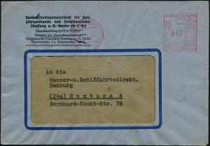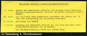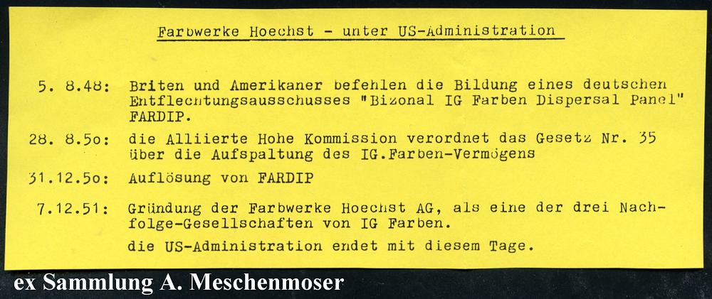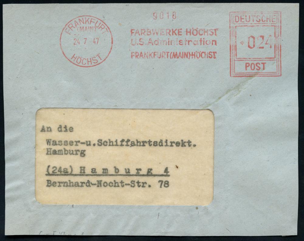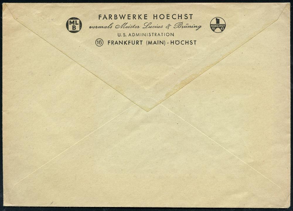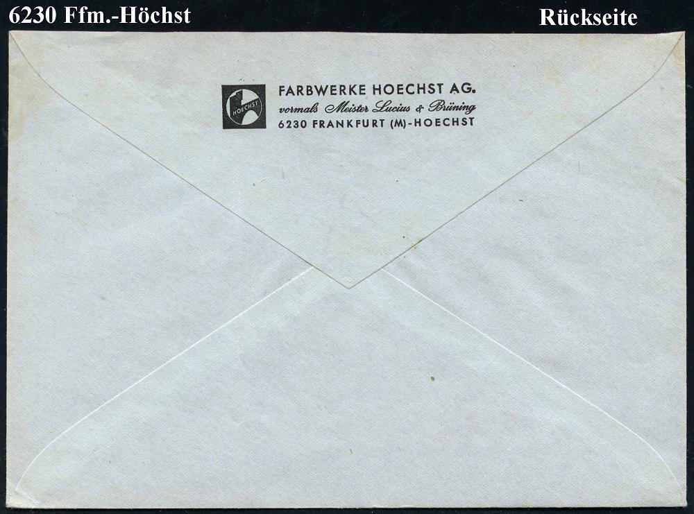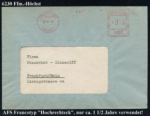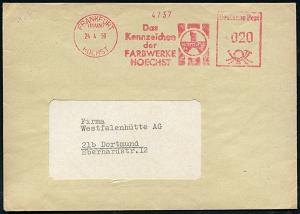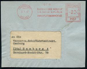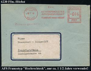 834 | 25 € | 6230 Frankfurt/M.-Höchst : FRANKFURT/ (MAIN)/ HÖCHST/ Das/ Kennzeichen/ der/ FARBWERKE/ HOECHST 1950 (24.4.) seltener AFS Francotyp (Firmen-Logo) rs. Abs.-Vordruck: FARBWERKE HOECHST.. U.S. ADMINISTRATION = alliierte Kontrolle ehem. Rüstungs-Betrieb!, Fern-Bf. (Dp.E-20CGh , Nr.175 h) | ![]() ![]() | |