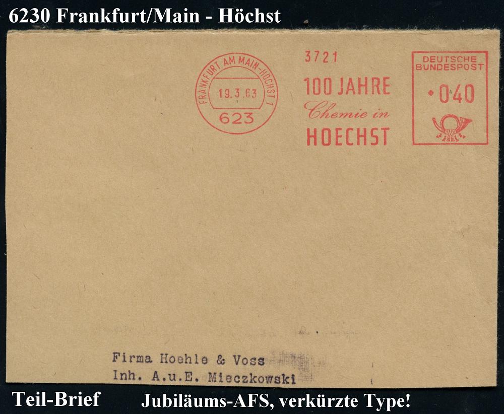 836 | 15 € | 6230 Frankfurt/M.-Höchst : 623 FRANKFURT AM MAIN-HÖCHST 1/ 100 JAHRE/ Chemie in/ HOECHST 1963 (19.3.) Jubil-AFS, Francotyp, verkürzte Spezialtype mit alter Zählnr. , klar gest. Teil-Bf. (Dü.223 CII h) | ![]() | |