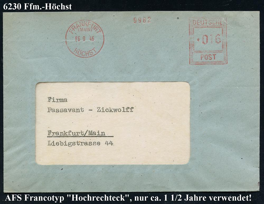 831 | 25 € | 6230 Frankfurt/M.-Höchst : FRANKFURT/ (MAIN)/ HÖCHST/ I.G.FARBENINDUSTRIE/ AG.. #bzw.# FARBWERKE HÖCHST/ U.S.Administration 1946/47 2 verschiedene, seltene AFS, Francotyp "Hochrechteck" auf 2 Bedarfs-Vorderseiten. (1x Abs.-Vordruck) 2 Belege (Dü.E-18CG, Nr.155, nur kurze Verwendung!) | ![]() ![]() ![]() | |