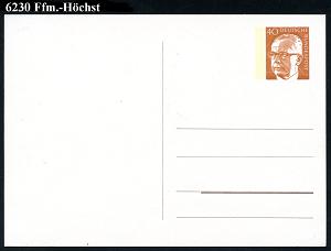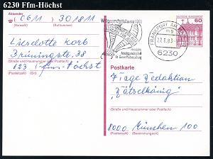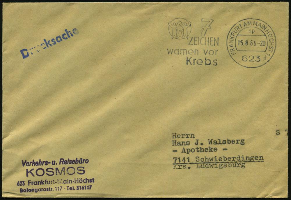 838 | 12 € | 6230 Frankfurt/M.-Höchst : 623 FRANKFURT AM MAIN HÖCHST 1/ sp/ 7/ ZEICHEN/ warnen vor/ Krebs 1966 (15.8.) MWSt (stilis. Familie) unfrankierte Drs. ohne Nachgebühr (Bo.S 1172 A , nur in 2 Orten verwendet!) | ![]() | |