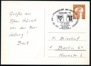 842 | 10 € | 6230 Frankfurt/M.-Höchst : 6230 FRANKFURT AM MAIN 80/ HÖCHST´75/ DAS TOR ZUR THEMABELGA 1975 (7.9.) SSt auf passender PP 40 Pf. Heinemann: Höchst ´75.. THEMABELGA (Mi.PP 48/7, div. Briefmarken, BRD, Luxemburg, Belgien) Inl.-Karte (Bo.692, nur am 7.9.) | ![]() ![]() | |