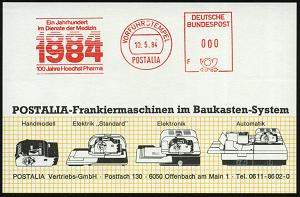 846 | 18 € | 6230 Frankfurt/M.-Höchst : Frankfurt/ Main-Höchst 1984 (10.5.) AFS.: VORFÜHRSTEMPEL/POSTALIA/F/Ein Jahrhundert/im Dienste der Medizin/1884 1984/100 Jahre Hoechst Pharma , seltene Postalia-Musterkarte (= Specimen) | ![]() | |