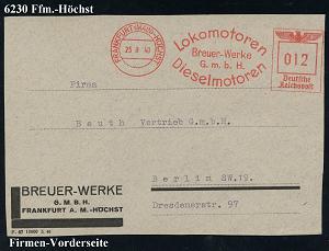829 | 18 € | 6230 Frankfurt/M.-Höchst : FRANKFURT (MAIN).HÖCHST/ LOKOMOTOREN/ Dieselmotoren/ Breuer-Werke/ GmbH 1940 (25.8.) AFS Francotyp "Reichsadler" klar auf Firmen-Vorderseite: BREUER-WERKE.., vergl. Nr. 828 (Dü.E-5CGo) | ![]() | |