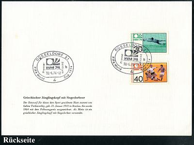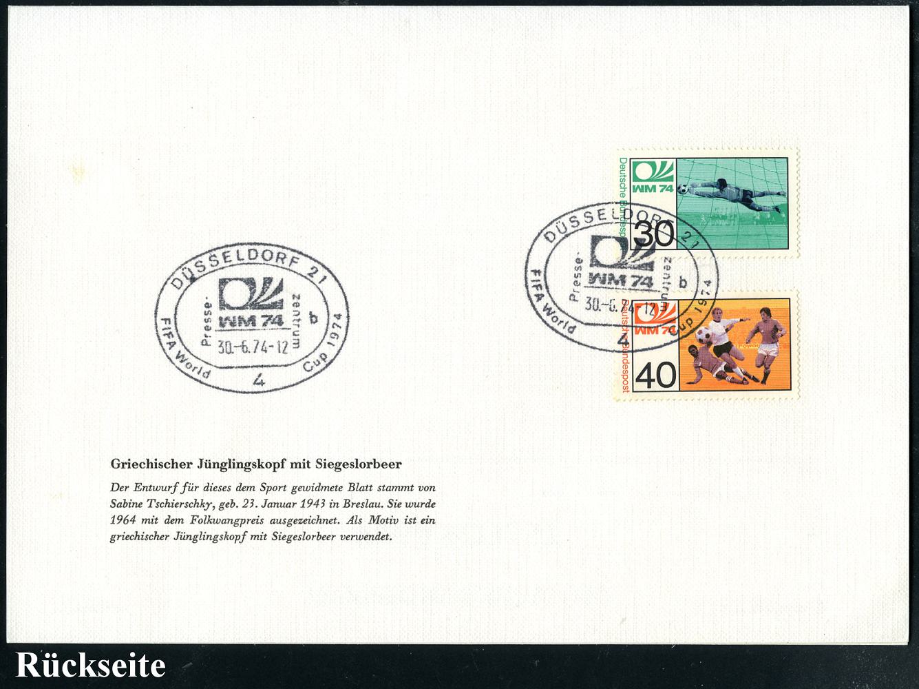 6249 | 18 € | 4000 Düsseldorf Sonderstempel : 4 DÜSSELDORF 21/ WM 74/ Presse-/ Zentrum/ b/ FIFA World Cup 1974 (12.6.) SSt auf kompl. Satz Fußball-WM (Mi.811/12) auf Schmuckblatt-Telegramm "Sport" (Griech. Jünglingskopf m.Siegeslorbeer) ungebr. | ![]() ![]() | |