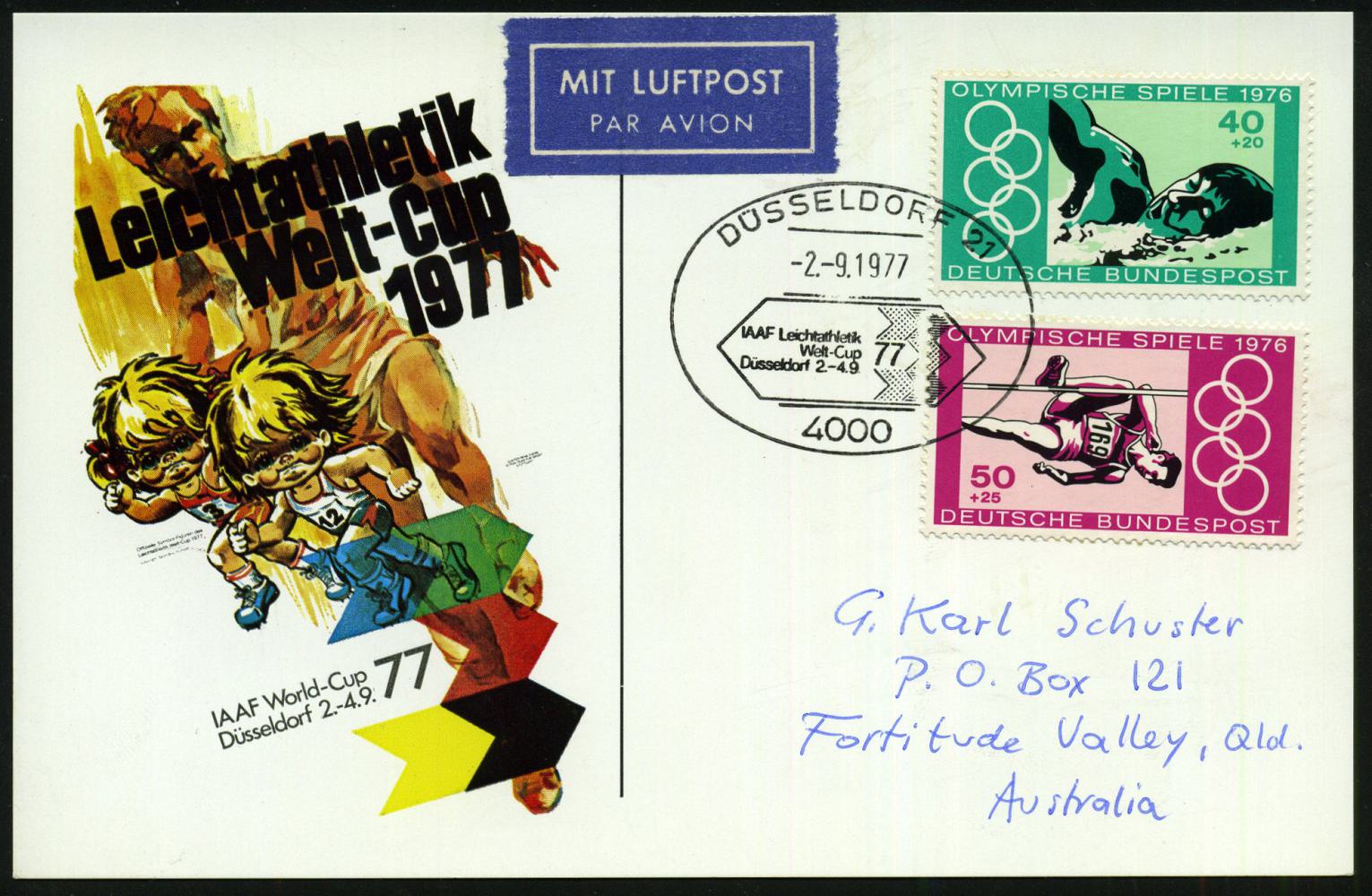6253 | 16 € | 4000 Düsseldorf Sonderstempel : 4000 DÜSSELDORF 21/ IAAF Leichtathletik/ Welt-Cup 1977 (2.9.) SSt auf kompl. Satz Olympiade Montreal (Mi.886/87) portorichtige Übersee-Flp.-Sonder-Kt.: IAAF World-Cup 77 (Bo.536 ,Eröffnungstag) | ![]() | |