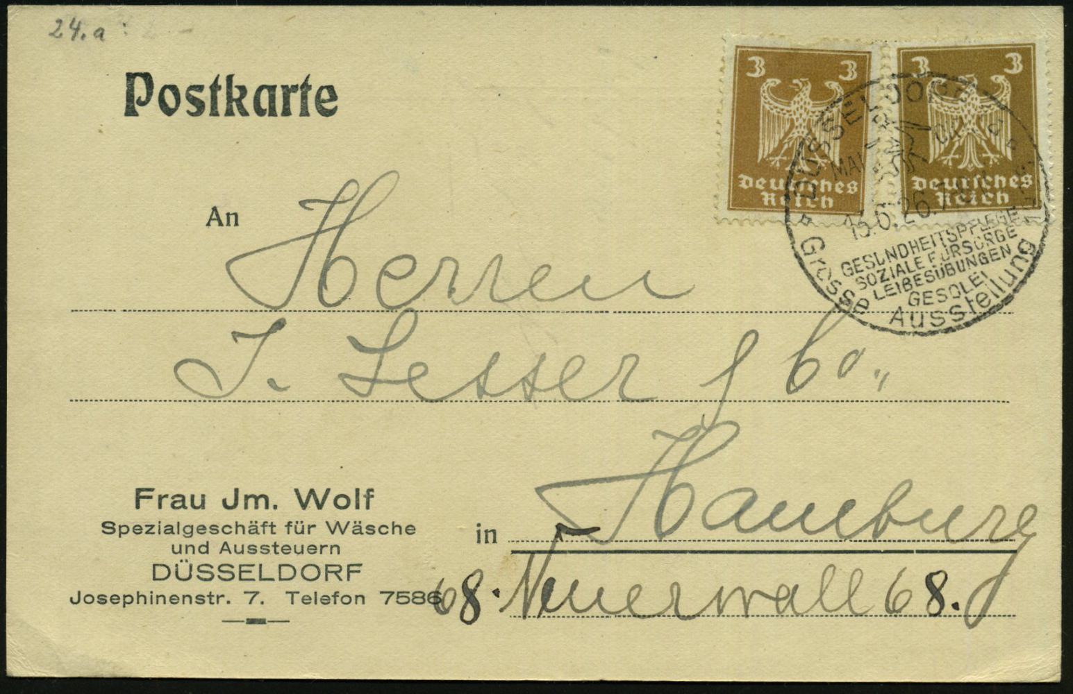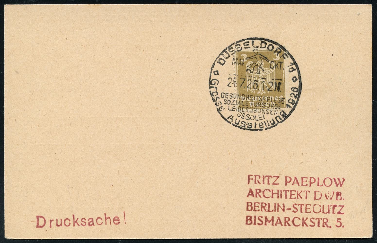 6201 | 16 € | 4000 Düsseldorf Sonderstempel : DÜSSELDORF 1a/ GESUNDHEITSPFLEGE/ SOZ.FÜRSORSORGE/ LEIBESÜBUNGEN/ GESOLEI/ Gr.Ausstellung 1926 (13.6.) HWSt mit UB "a" (Mann tritt auf Schlange) klar gest. Firmen-Kt.: Frau Jm. Wolf.. (Bo.24 a) | ![]() | |