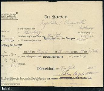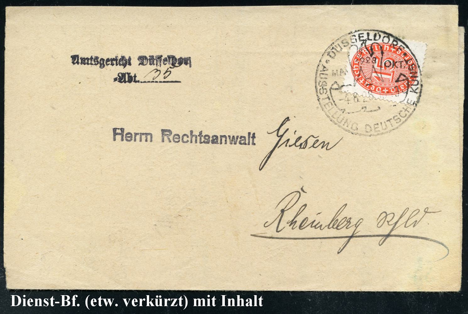 6205 | 18 € | 4000 Düsseldorf Sonderstempel : DÜSSELDORF/ AUSSTELLUNG DEUTSCHE KUNST 1928 (4.8.) HWSt (Logo) auf EF 15 Pf. Dienst, klar gest. Falt-Dienst-Bf. mit Inhalt (Amtgericht, nicht ganz vollständig) = Zeugen-Ladung (Bo.27) | ![]() ![]() | |