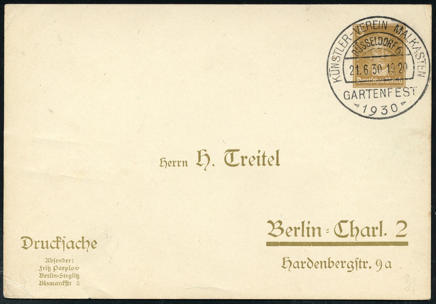6206 | 28 € | 4000 Düsseldorf Sonderstempel : DÜSSELDORF 6/ KÜNSTLER-VEREIN MALKASTEN/ GARTENFEST 1930 (21.6.) seltener SSt auf PP 3 Pf. Goethe, braun (H. Treitel, Mi.PP 97/B6, minim. Eckbugspur) glasklar gest.! (Bo.31) | ![]() | |