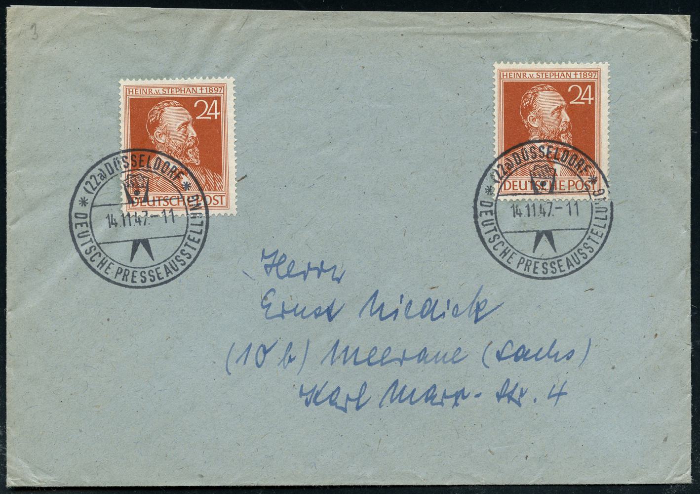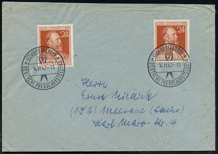 6214 | 16 € | 4000 Düsseldorf Sonderstempel : (22a) DÜSSELDORF/ DEUTSCHE PRESSEAUSSTELLUNG 1947 (14.11.) SSt (Figur mit Zeitung) 2x klar gest. Fern-Bf. in die SBZ (Bo.59) | ![]() | |