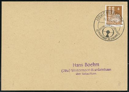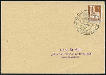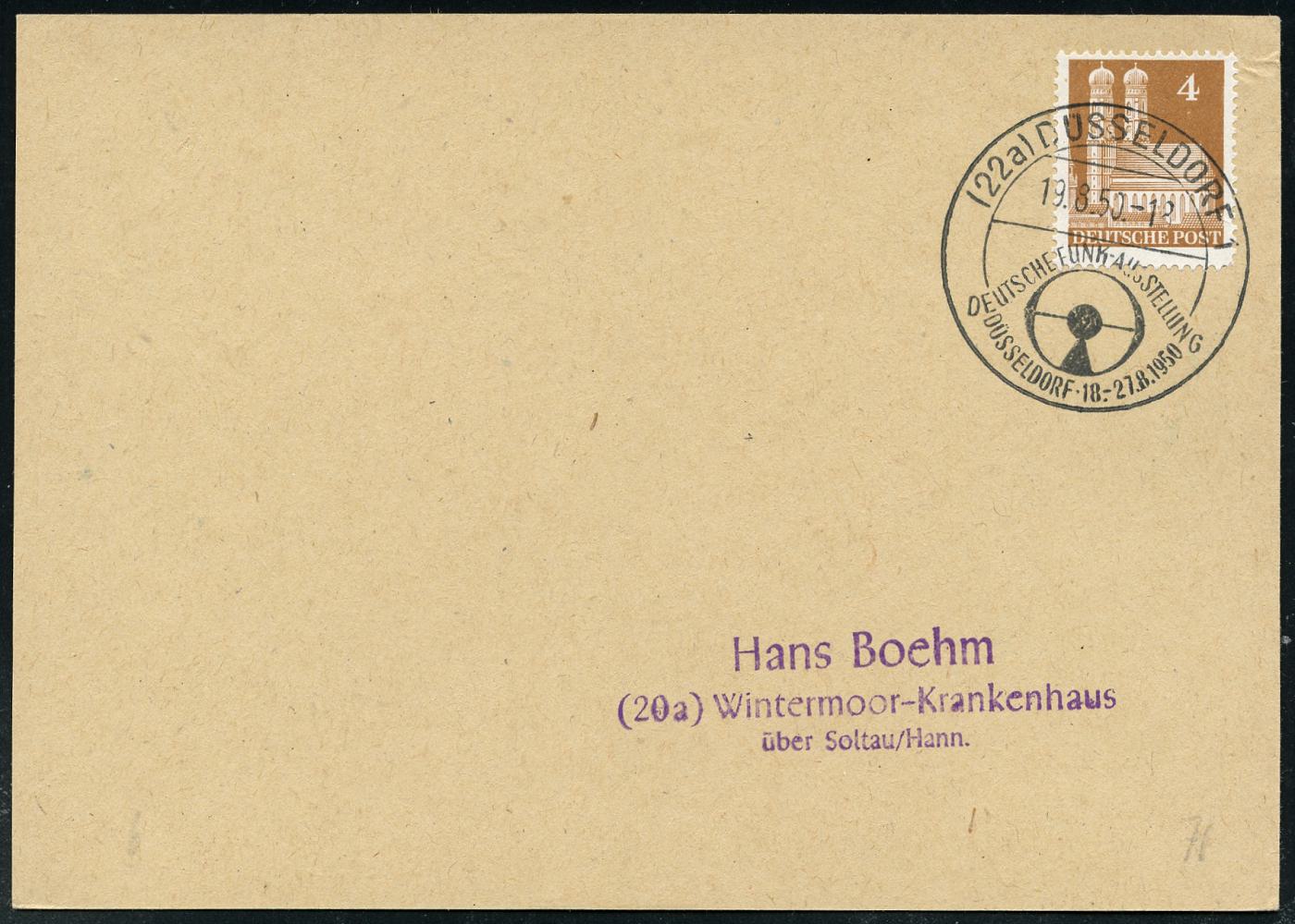 6218 | 10 € | 4000 Düsseldorf Sonderstempel : (22a) DÜSSELDORF/ DEUTSCHE FUNK-AUSSTELLUNG 1950 (19.8.) SSt (Sende-Logo) klar ges. Inl.-Drs.-Karte (Bo.71) | ![]() | |