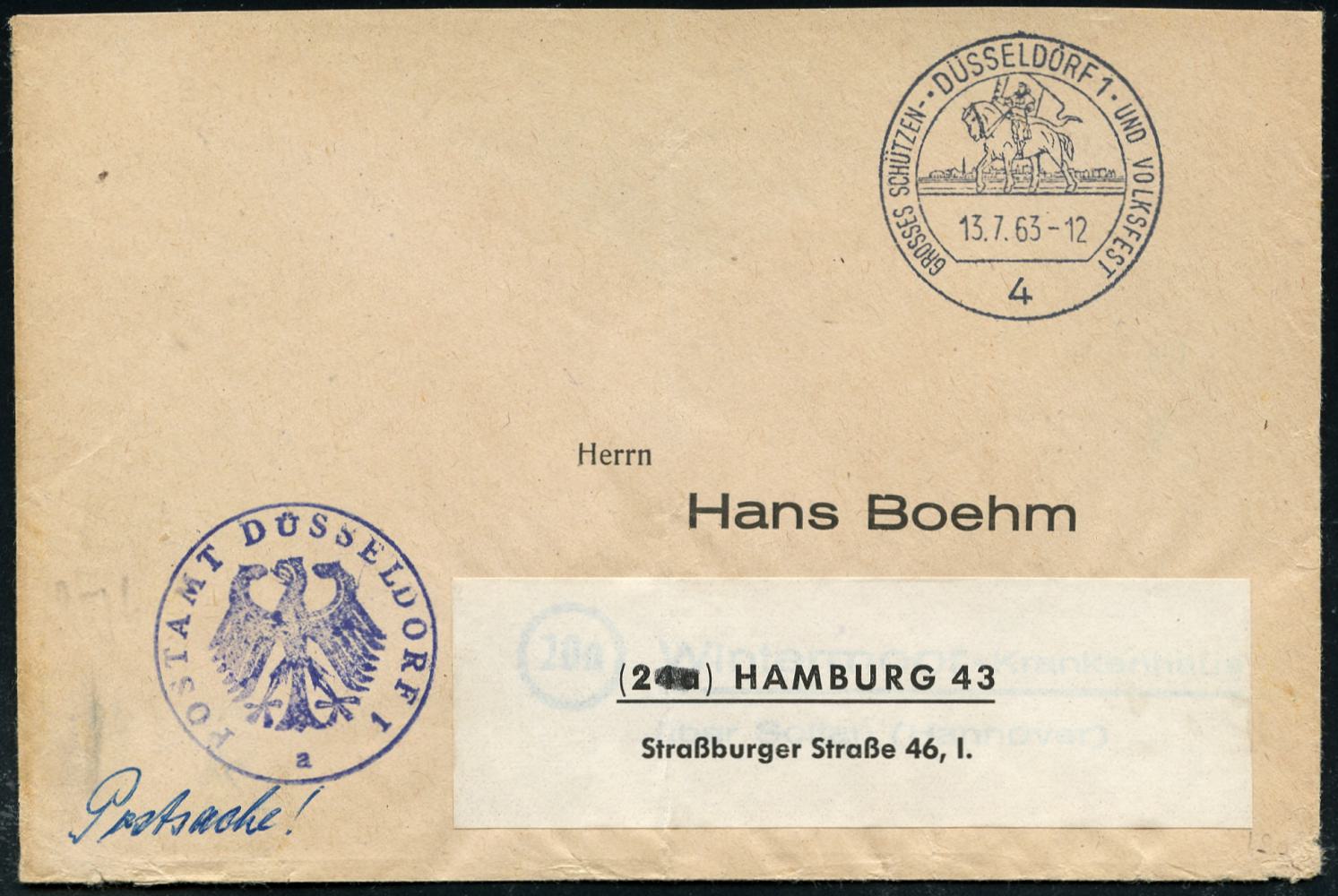 6236 | 10 € | 4000 Düsseldorf Sonderstempel : 4 DÜSSELDORF 1/ GROSSES SCHÜTZEN- UND VOLKSFEST 1963 (13.7.) SSt (Reiter-Denkmal) + blauer 1K-HdN: POSTAMT DÜSSELDORF 1/a (Bf. fehlt rs. Klappe) Postdienst-Bf. (gefaltet, da Antwort-Bf.) klar gest.! (Bo.190) | ![]() | |