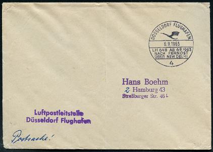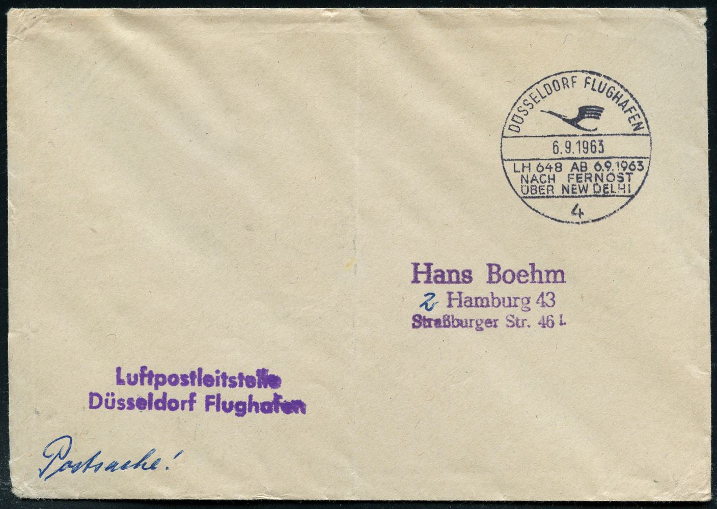 6237 | 12 € | 4000 Düsseldorf Sonderstempel : 4 DÜSSELDORF FLUGHAFEN/ LH 648 ab 6.9.1965/ NACH FERNOST/ ÜBER NEW DELHI 1963 (6.9) SSt (DLH-Logo) + amtl. viol. Abs.-2L: Luftpostleitstelle/ Düsseldorf Flughafen auf Postdienst-Bf. (gefaltet da Antwort-Bf.) klar gest. (Bo.204) | ![]() | |