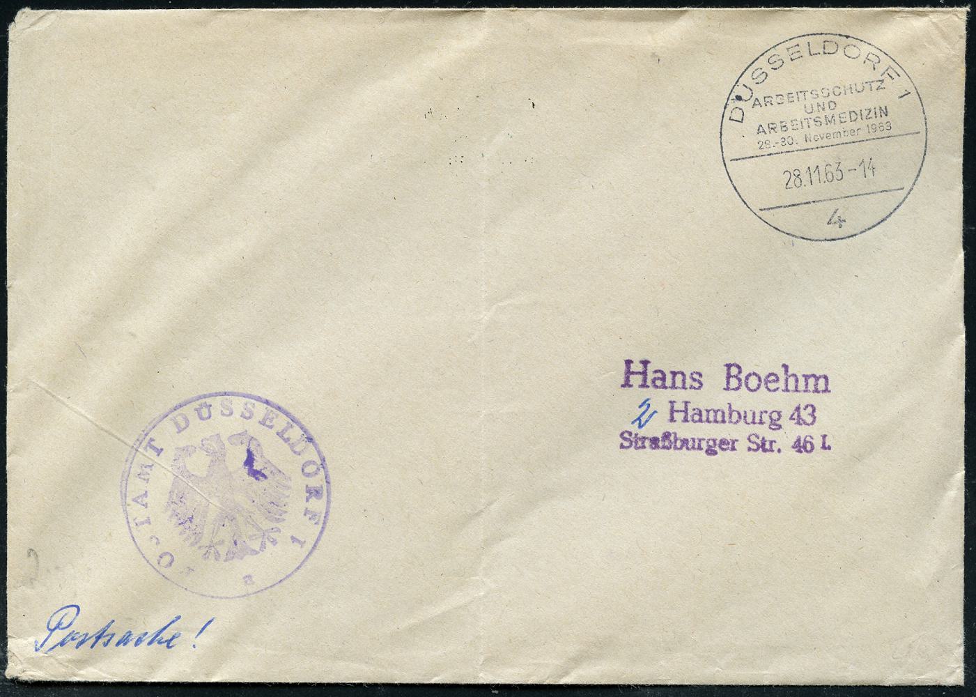 6238 | 8 € | 4000 Düsseldorf Sonderstempel : 4 DÜSSELDORF 1/ ARBEITSSCHUTZ/ UND/ ARBEITSMEDIZIN 1963 (28.11.) SSt + viol. Dienst-HdN: POSTAMT DÜSSELDORF !/a, "1!´" kopfstehend! (Bundesadler) Postdienst-Bf. (schwach gefaltet, da Antwort-Bf.) n. Hamburg (Bo.210) | ![]() | |