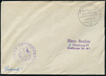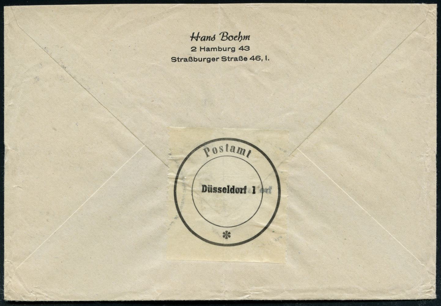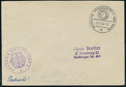 6239 | 12 € | 4000 Düsseldorf Sonderstempel : 4 DÜSSELDORF 1/ Britische Woche 1964 (23.5.) SSt (Einhornkopf) + viol., amtl. 1K-HdN: POSTAMT DÜSSELDORF 1/a ("1" kopfstehend) Postdienst-Bf. (schwach gefaltet, da Antwort-Bf.) klar gest., rs. amtl. Verschlußzettel: Postamt Düsseldorf 1 (Bo.215) | ![]() ![]() | |