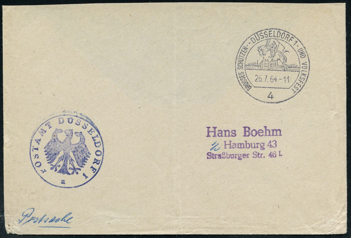 6241 | 8 € | 4000 Düsseldorf Sonderstempel : 4 DÜSSELDORF 1/ GROSSES SCHÜTZEN- UND VOLKSFEST 1964 (26.7.) SSt (Reiterdenkmal) + amtl. blauer 1K-HdN: POSTAMT DÜSSELDORF 1/a ("1" kopfstehend) Postdienst-Bf. (rs. fehlt Klappe, schwache Mittelfalte, da Antwort-Bf.) klar gest.! (Bo.190) | ![]() | |