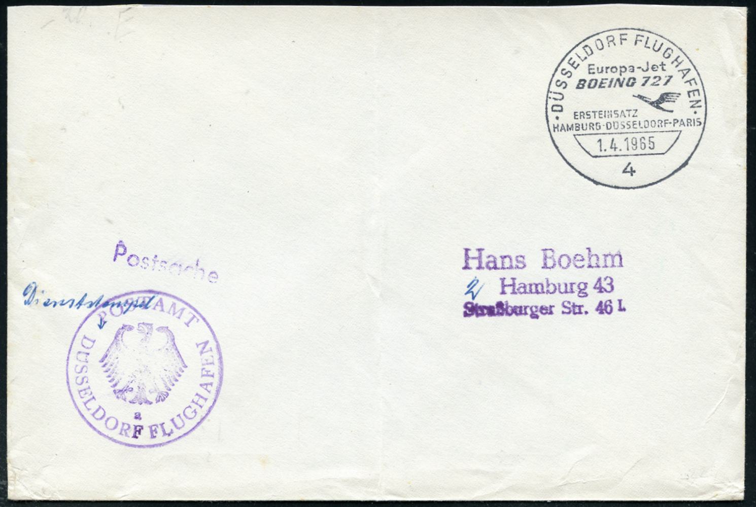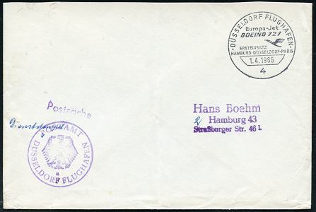 6242 | 10 € | 4000 Düsseldorf Sonderstempel : 4 DÜSSELDORF FLUGHAFEN/ Europa-Jet/ BOEING 727/ ERSTEINSATZ/ HAMBURG-DÜSSELDORF-PARIS 1965 (1.4.) SSt (DLH-Logo) + viol. amtl. 1K-HdN: POSTAMT/ DÜSSELDORF FLUGHAFEN/a (Bf. Falte, da Antwort-Bf.) klar gest. Postdienst-Bf., rs. Flughafen-Werbevignette! (Bo.224) | ![]() ![]() | |
