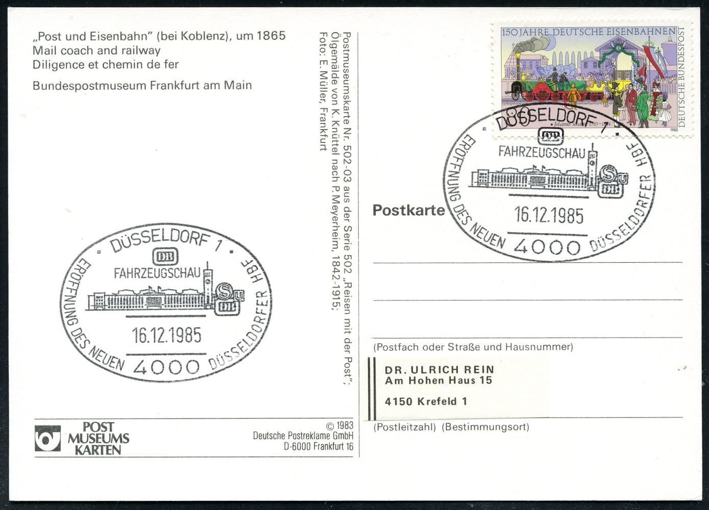 6257 | 10 € | 4000 Düsseldorf Sonderstempel : 4000 DÜSSELDORF 1/ DB/ FAHRZEUGSCHAU/ ERÖFFNUNG DES NEUEN DÜSSELDORFER HBF 1985 (16.12.) SSt = Hauptbahnhof 2x auf passender Eisenbahn-Frankatur u. motiv-ähnl. Künstler-Ak. | ![]() ![]() | |
