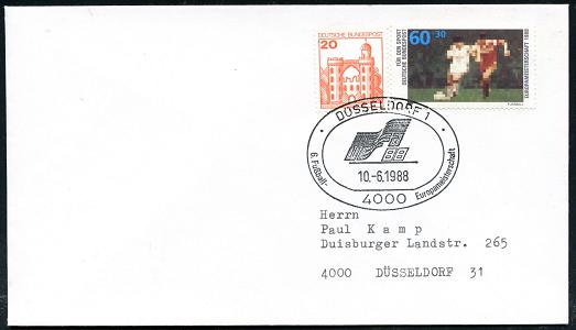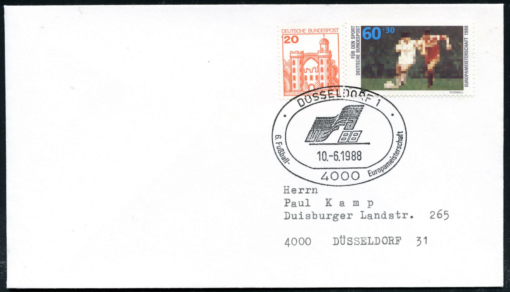 6261 | 8 € | 4000 Düsseldorf Sonderstempel : 4000 DÜSSELDORF 1/ UEFA 88/ 6.Fussball-Europameisterschaft 1988 (10.6.) SSt auf 60 + 30 Pf. Fußball u.a., klar gest. Orts-Bf. | ![]() | |