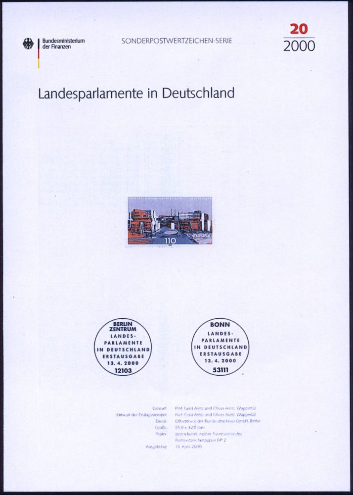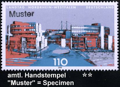 6191 | 30 € | 4000 Düsseldorf Sonderstempel : Düsseldorf 2000 110 Pf. Landesparlament Nordrhein-Westfalen, Düsseldorf mit amtl. Handstempel "M u s t e r" , postfr. + amtl. Ankündigungsblatt des Bundesfinanzministeriums (Format A4) 2 Belege kompl.!, selten! (Mi.2110 Muster = Specimen!) | ![]() ![]() | |