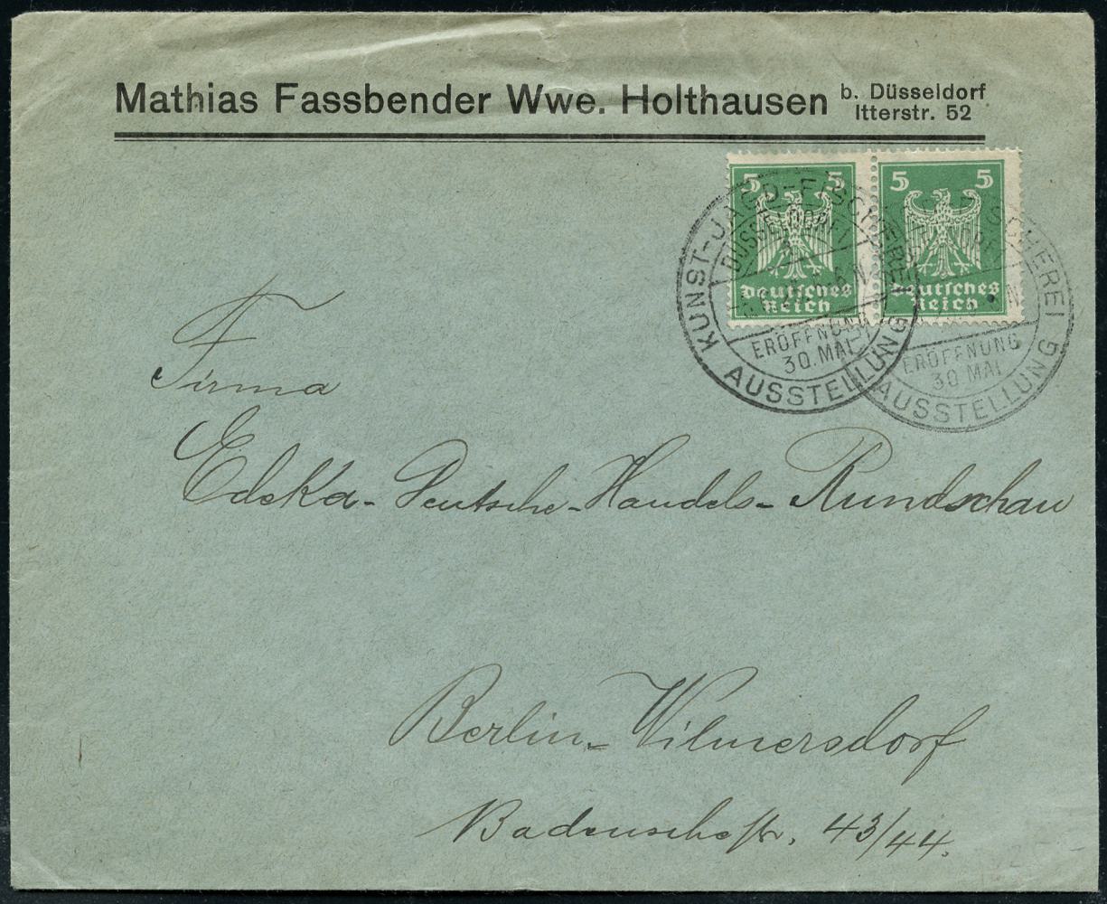 6197 | 20 € | 4000 Düsseldorf Sonderstempel : DÜSSELDORF 1/ d/ KUNST-JAGD-FISCHEREI/ AUSSTELLUNG 1925 (5.6.) HWSt 2x klar auf Firmenbf.: Mathias Fassbender Wwe. Holthausen.. (Bo.15 d) | ![]() | |