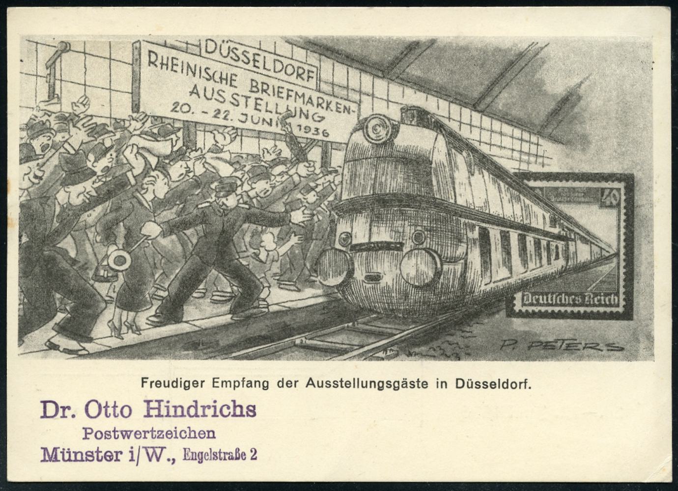 6209 | 25 € | 4000 Düsseldorf Sonderstempel : DÜSSELDORF/ Rhein.Briefmarken-/ Ausstellung 1936 (21.6.) SSt auf PP 3 Pf. Hindenbg., braun: Freudiger Empfang der Ausstellungsgäste (Stromlinien-Dampflok fährt aus Briefmarke in den Bahnhof) Karrikatur v. P.Peters (Mi.PP 122/C 26) Bedarf (Bo.40) | ![]() ![]() | |