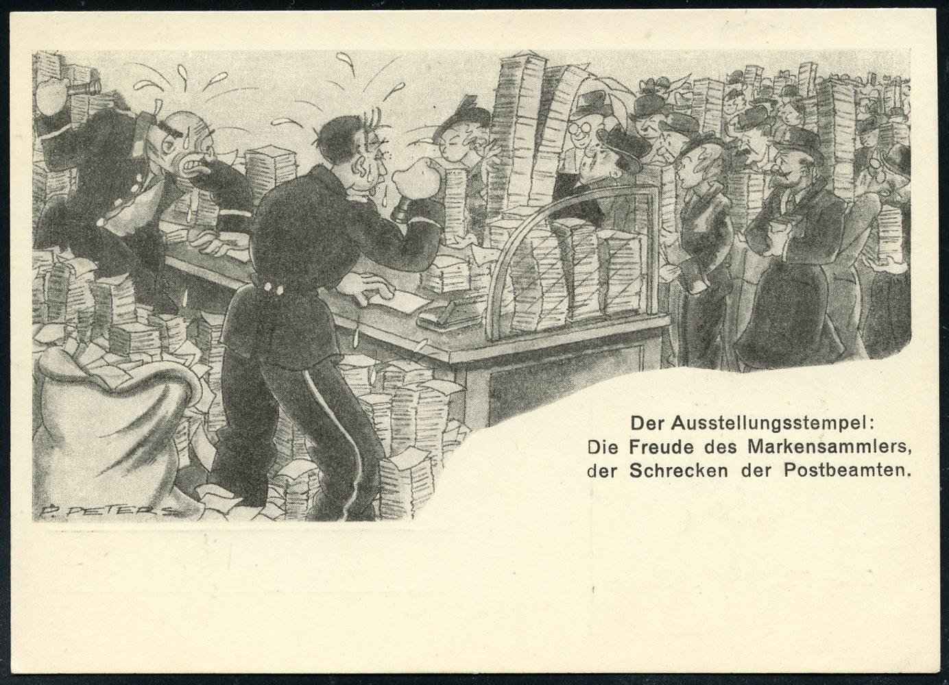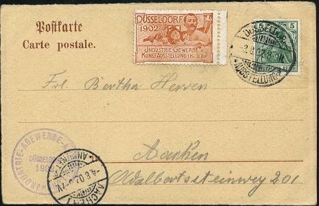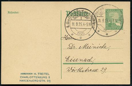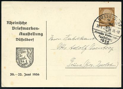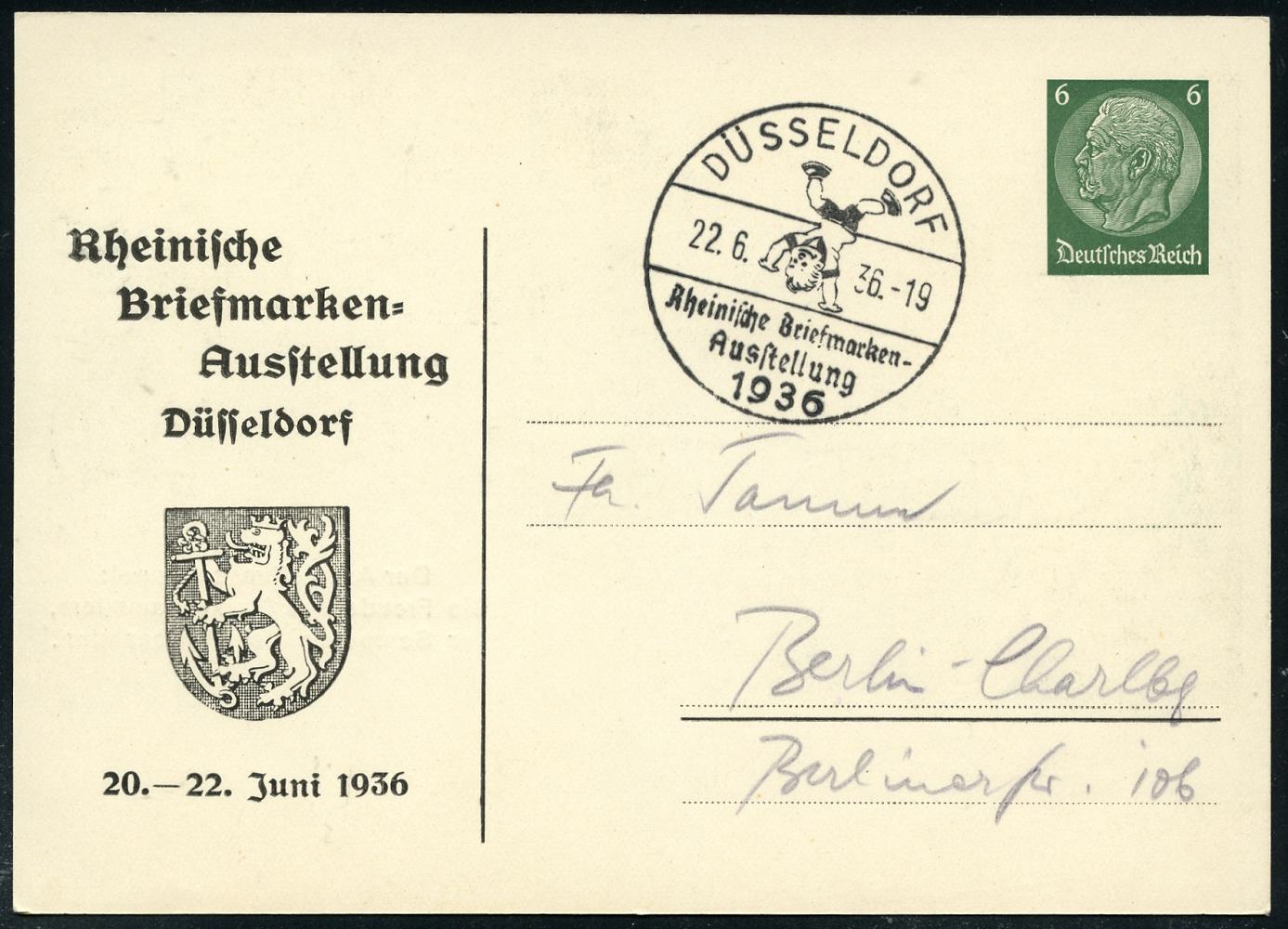 6210 | 28 € | 4000 Düsseldorf Sonderstempel : DÜSSELDORF/ Rhein.Briefmarken-/ Ausstellung 1936 (22.6.) SSt (Rad schlagendes Kind) neben Werteindruck PP 6 Pf. Hindenbg.: "..Schrecken der Postbeamten" (PP 127/C 19) wegen des Spotts von der OPD nicht zu Beförderung zugelassen und daher neben dem Werteindruck gestempelt als Inl.Kt., echt gelaufen! (Bo.40) | ![]() ![]() | |