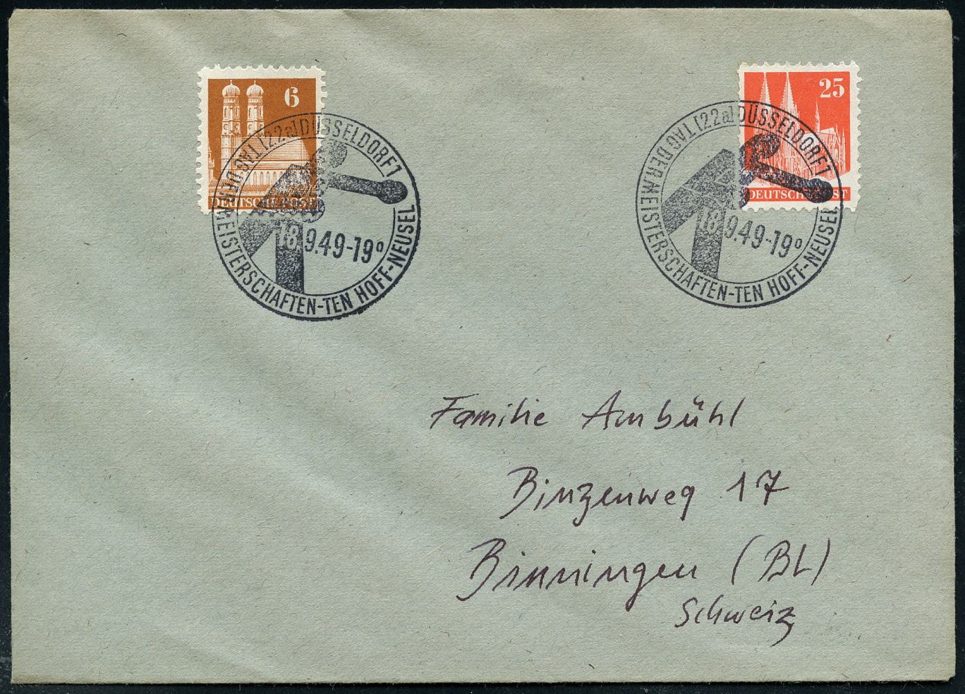 6216 | 25 € | 4000 Düsseldorf Sonderstempel : (22a) DÜSSELDORF 1/ TAG DER MEISTERSCHAFTEN TEN HOFF-NEUSEL 1949 (18.9.) SSt (Boxer-Piktogr.) 2x klar auf Bauten-Frankatur, Ausl.-Bf. (Bo.66) | ![]() | |