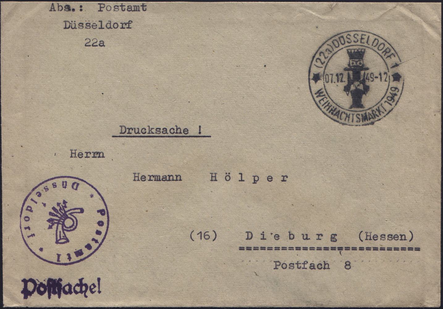 6217 | 16 € | 4000 Düsseldorf Sonderstempel : (22a) DÜSSELDORF 1/ WEIHNACHTSMARKT 1949 (7.12.) SSt (Nußknacker) + viol. 1K-HdN: Postamt 1/f/Düsseldorf klar auf Postdienst-Bf. (Bo.67) | ![]() | |