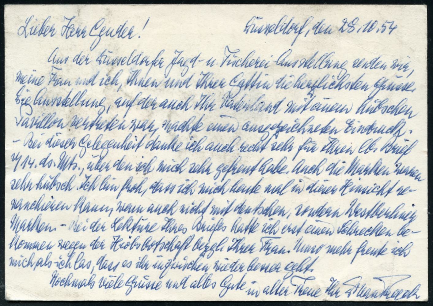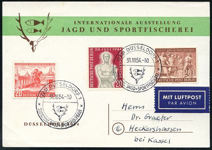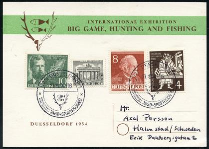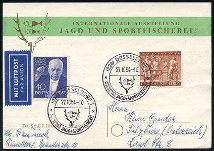 6221 | 20 € | 4000 Düsseldorf Sonderstempel : (22a) DÜSSELDORF 1/ INT./ AUSSTELLUNG/ JAGD+SPORTFISCHEREI 1954 (16.10.) SSt = 2 Fische u. Geweih 2x klar auf besserer Ausl.-Frankatur (Mi.+ 26.- EUR) motivgl. Ausl.-Sonder-Kt.! , Michaelis Nr. 17 (Bo.99) | ![]() | |