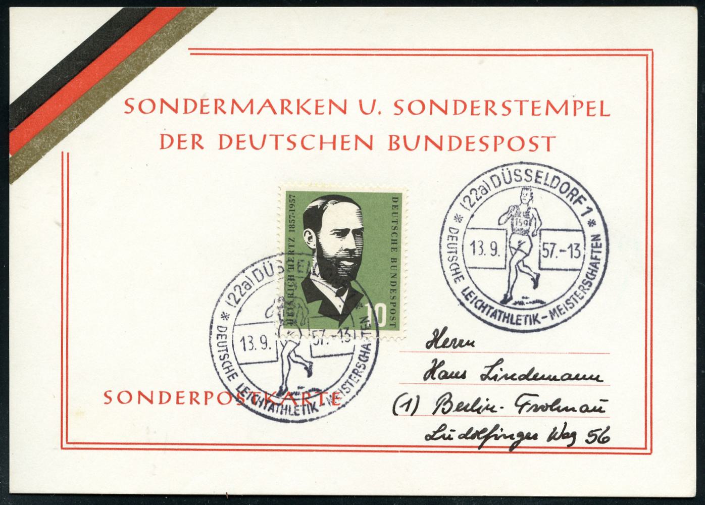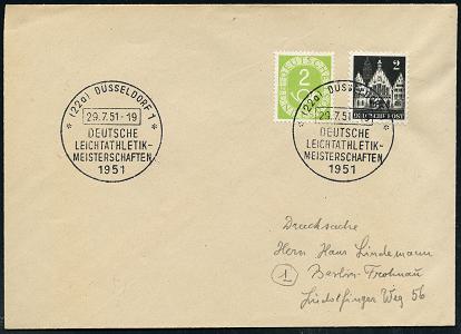 6220 | 16 € | 4000 Düsseldorf Sonderstempel : (22a) DÜSSELDORF 1/ DEUTSCHE/ LEICHTATHLETIK-/ MEISTERSCHAFTEN 1951 (29.7.) SSt , 2x klar auf Inl.-Drs.-Bf.. (Bo.76 = Finaltag) | ![]() | |