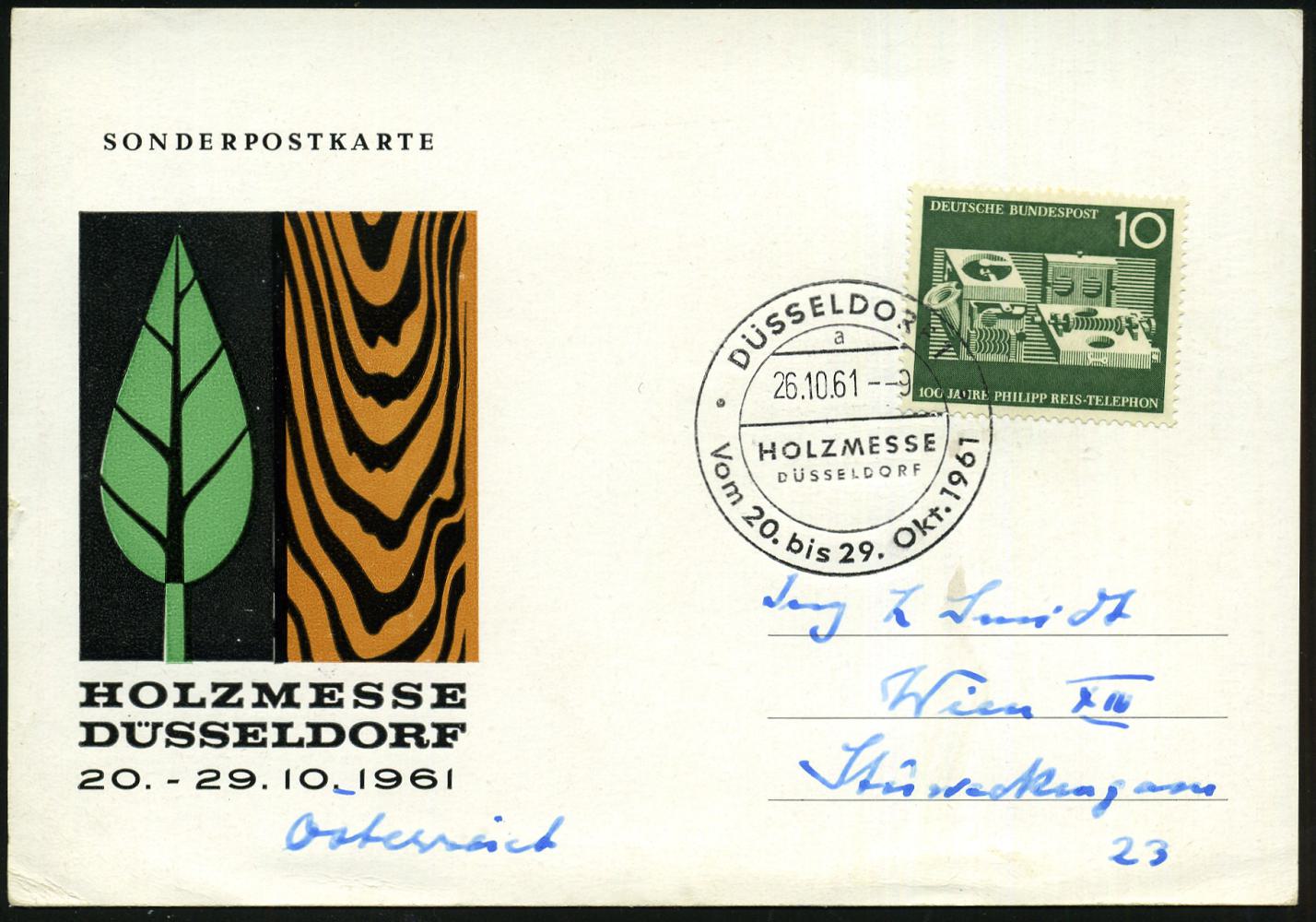 6233 | 16 € | 4000 Düsseldorf Sonderstempel : DÜSSELDORF 1/ a/ HOLZMESSE 1961 (26.10.) SSt klar auf zweifarbiger Sonder-Kt. (Bo.175 a) | ![]() | |