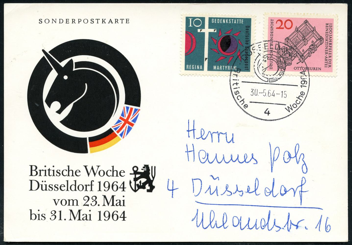 6240 | 15 € | 4000 Düsseldorf Sonderstempel : 4 DÜSSELDORF 1/ Britische Woche 1964 SSt (Einhornkopf, 2 Flaggen) auf motivgl. Sonder-Kt., (Bo.215) | ![]() | |
