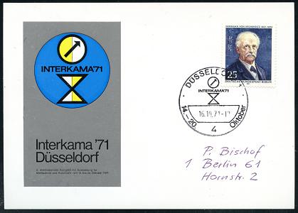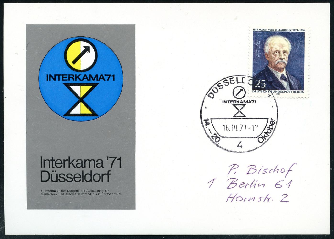6246 | 15 € | 4000 Düsseldorf Sonderstempel : 4 DÜSSELDORF 1/ INTERKAMA´71 1971 (16.10.) SSt (Logo) auf motivgl. Color-Sonder-Kt. = Internat. Kongreß u. Ausstellung für Messtechnik u. Automatik (Bo.366) | ![]() | |
