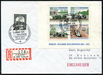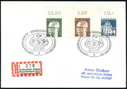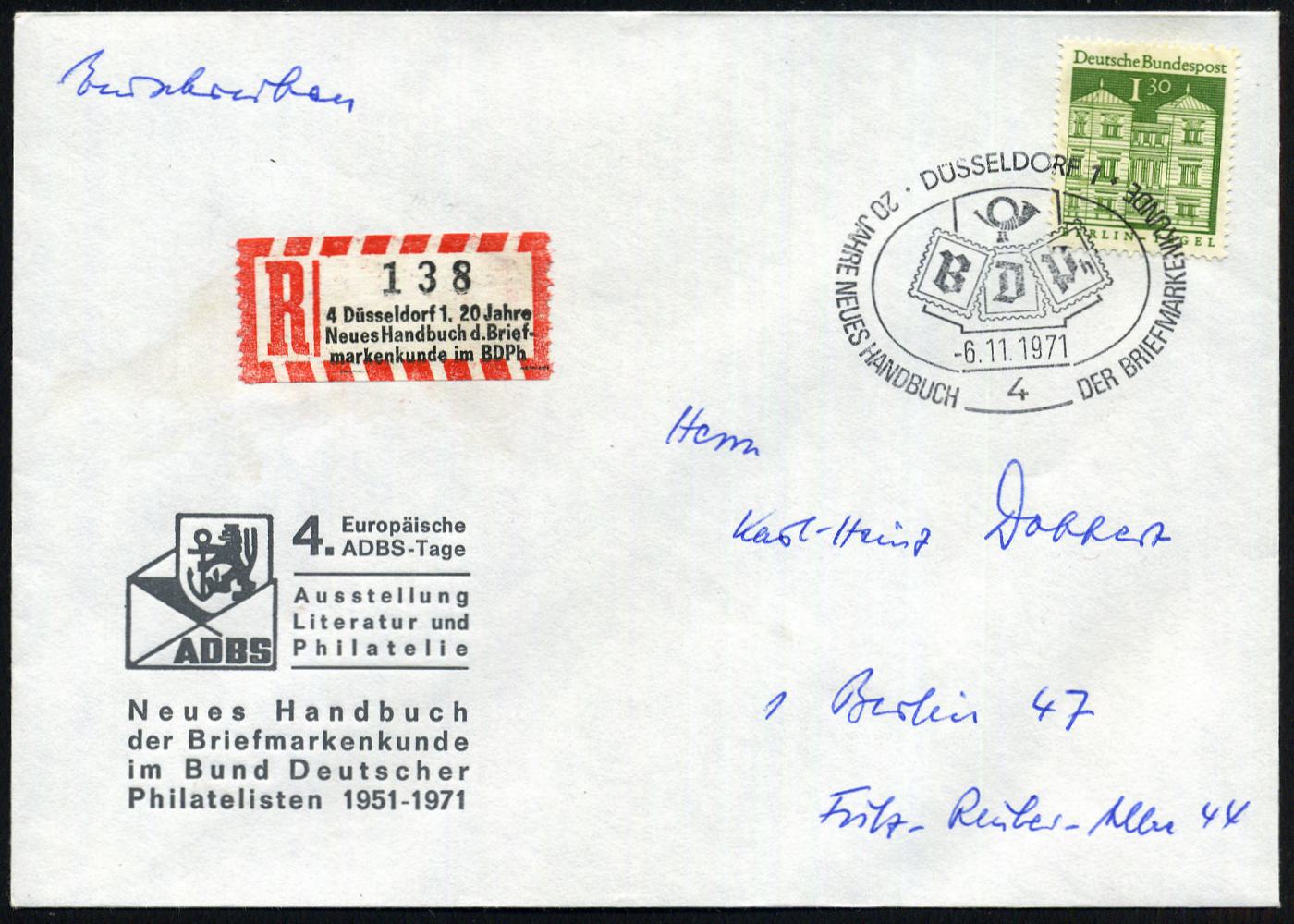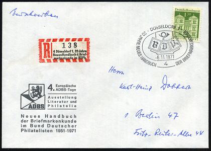 6245 | 20 € | 4000 Düsseldorf Sonderstempel : 4 DÜSSELDORF 1/ 50.TREFFPUNKT DER PHILATELISTEN.. 1971 (25.9.) SSt + Sonder-RZ: 4 Düsseldorf 1/a/50. ADBS-Treffpunkt (NEZ-Kat. Nr.183 a, Aufl. insges. nur 279 R-Briefe) klar gest. Inl.-R-Bf. R-Bf. (Aufl. 279 R-Belege) | ![]() | |