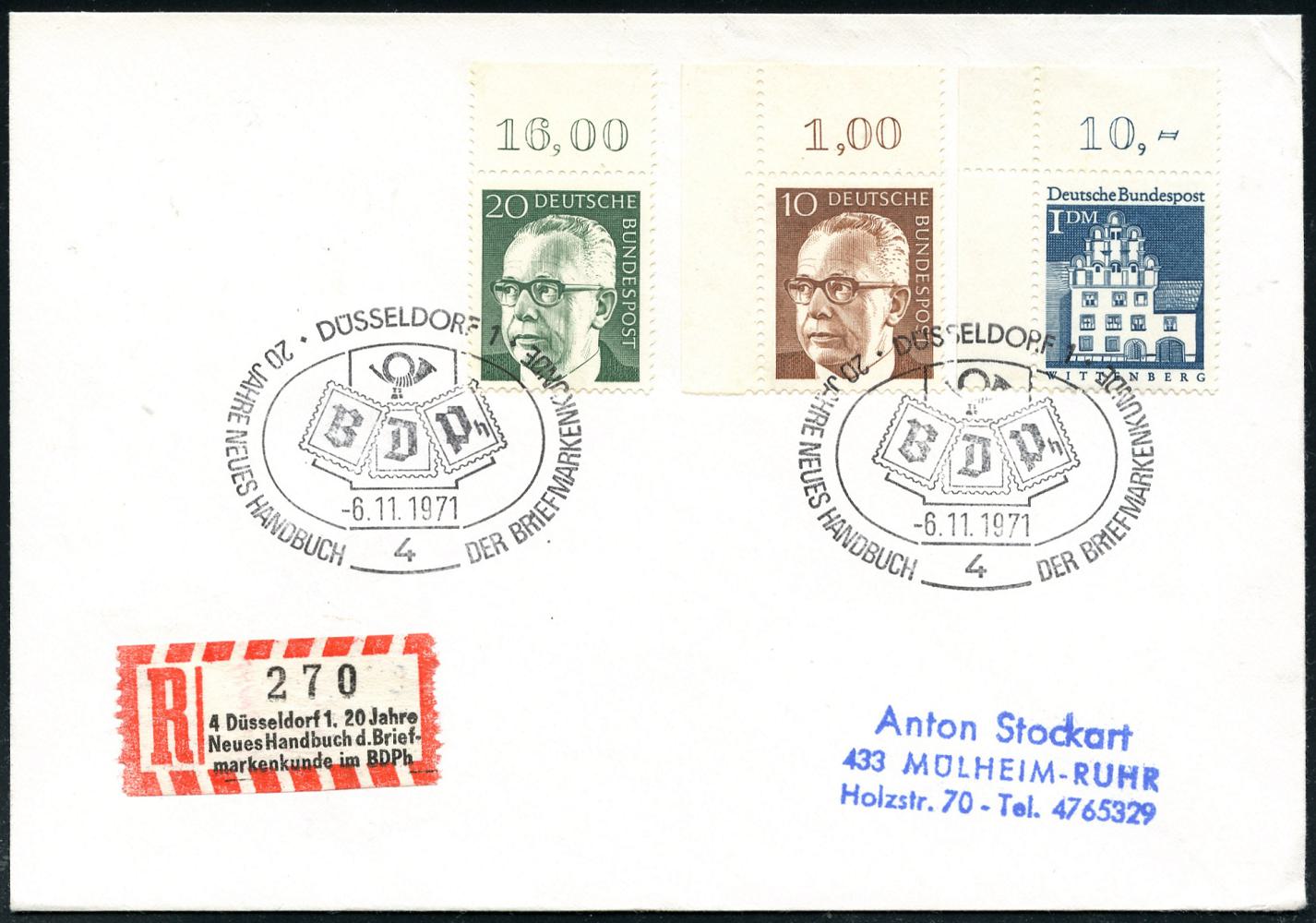 6248 | 18 € | 4000 Düsseldorf Sonderstempel : 4 DÜSSELDORF 1/ BDPh/ 20 JAHRE NEUES HANDBUCH.. 1971 (6.11.) SSt + Sonder-RZ: 4 Düsseldorf 1, 20 Jahre/Neues Handbuch d. Brief-/markenkunde im BDPh (NEZ Kat.Nr. 209 Ty.II = ohne Trennstrich) Aufl. nur 209 R-Belege!, klar gest. Inl.-R-Bf., (Bo.368) | ![]() | |