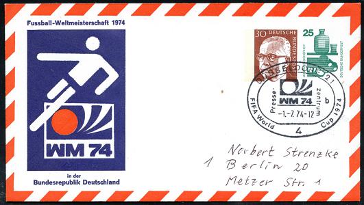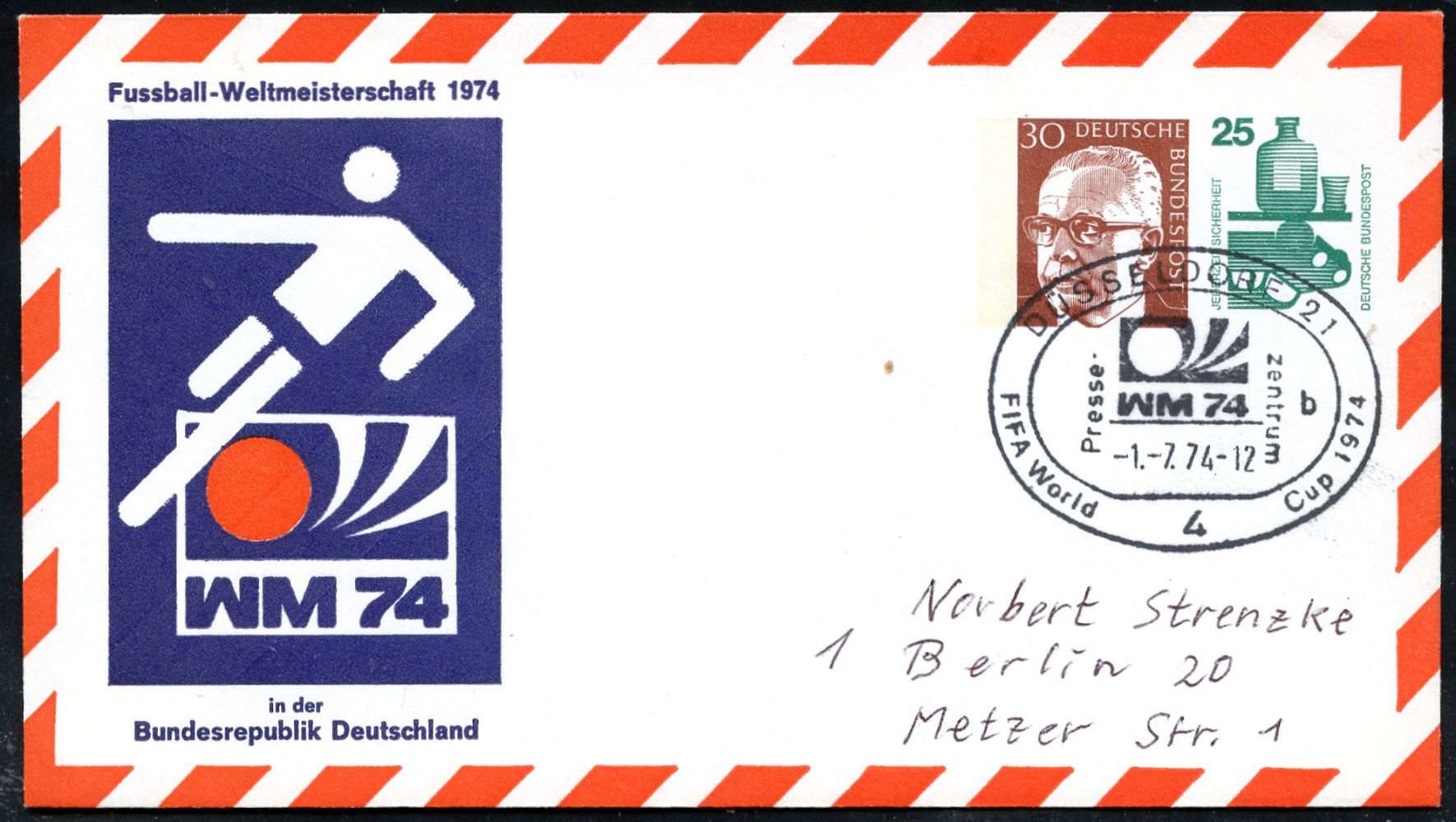 6250 | 18 € | 4000 Düsseldorf Sonderstempel : 4 DÜSSELDORF 21/ FIFA World Cup 1974/ WM 74/ Presse-/ zentrum 1974 (1.7.) SSt auf passendem PU 30 Pf. Heinemann + 25 Pf. Unfall (WM-Piktogramm) klar gest. Inl.-Flp.-Bf. n. West-Berlin (Mi.PU 74) | ![]() | |