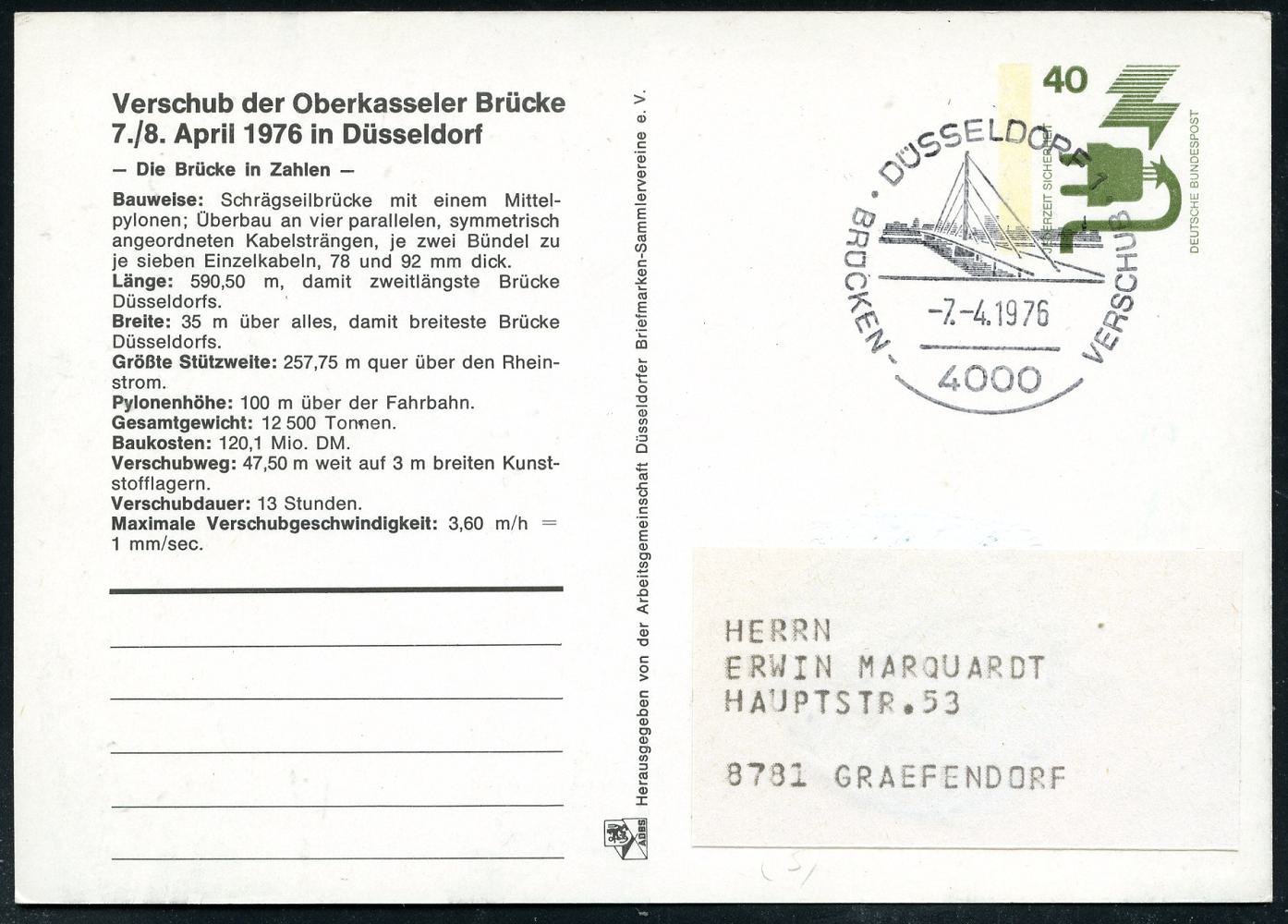 6252 | 15 € | 4000 Düsseldorf Sonderstempel : 4000 DÜSSELDORF 1/ BRÜCKEN-VERSCHUB 1976 (8.4.) SSt = Oberkasseler Rheinbrücke auf passender PP 40 Pf. Unfall: Verschub der Oberkasseler Brücke.. (3 Brücken-Versionen) Inl.-Karte (Mi.PP 69/34) | ![]() ![]() | |