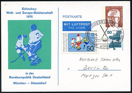 6251 | 16 € | 4000 Düsseldorf Sonderstempel : 4000 DÜSSELDORF 1/ WM im Eishockey 1975 (12.4.) SSt (2 Schläger, Puck) klar gest. PP 30+50 Pf.: Eishockey-WM/EM (Mi.PP 59) n. West-Berlin | ![]() | |